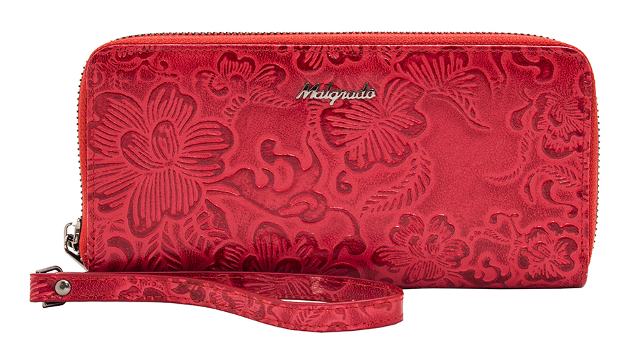 Женский клатч Malgrado из натуральной матовой кожи с цветочным тиснением. Под молнией внутри клатча 4 отделения, одно из них на молнии. В кошельке на боковых стенках есть по 4 кармашка для карточек и по 1 продольному кармашку. Закрывается на металлическую молнию. В комплект входит удобный съёмный кожаный ремешок.