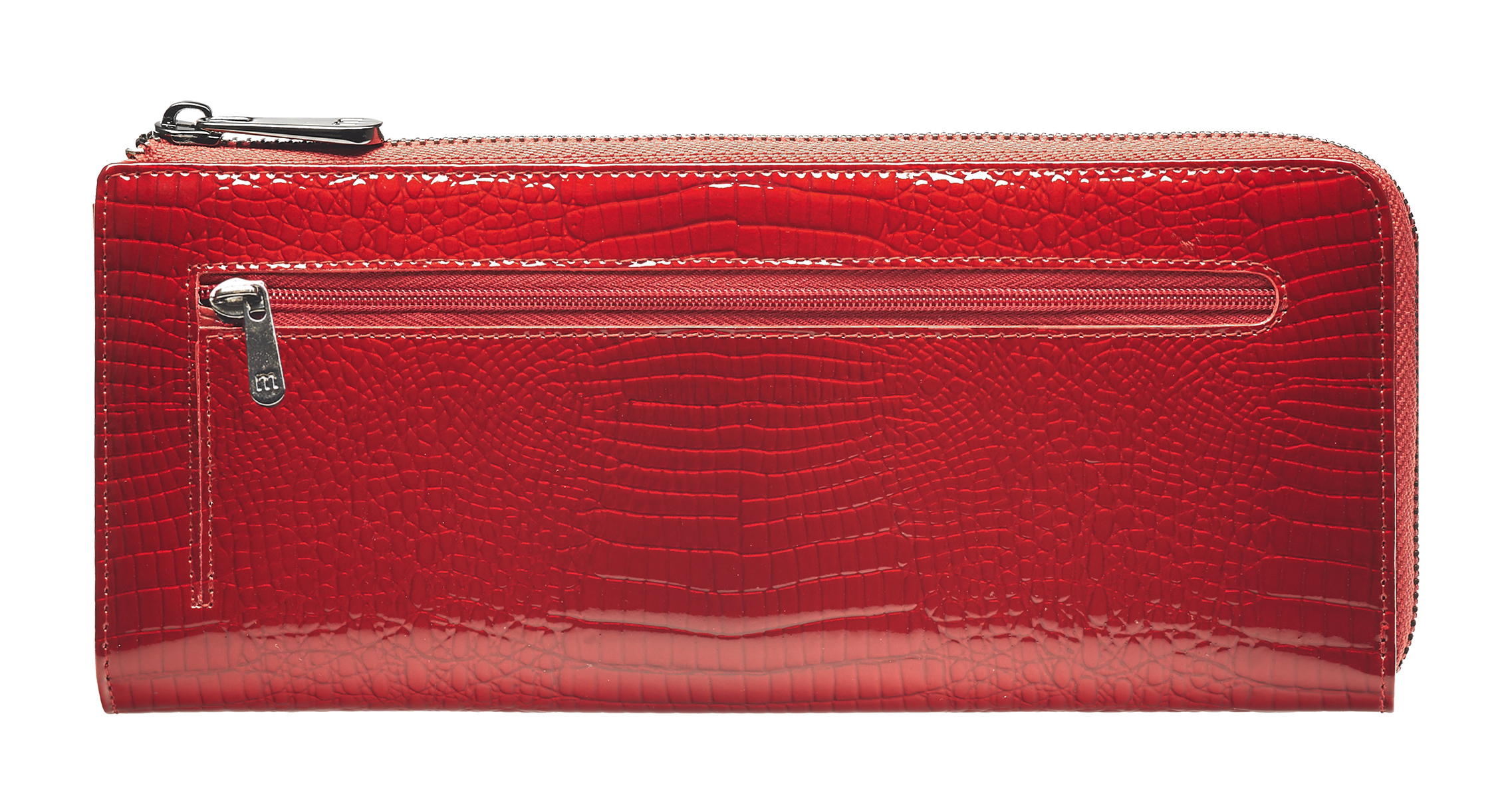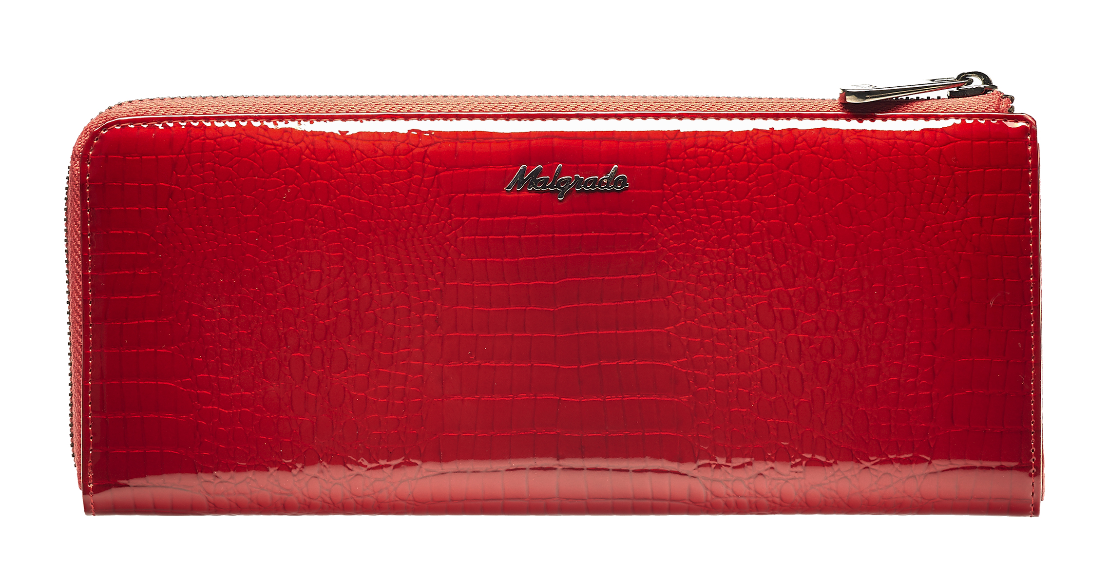 Женский клатч Malgrado из натуральной лаковой кожи с тиснением под рептилию. Под молнией внутри клатча 3 отделения, одно из них на молнии. В клатче на боковых стенках есть по 6 кармашков для карточек и по 1 продольному кармашку. Закрывается на металлическую молнию. На задней стороне кошелька есть кармашек на молнии.