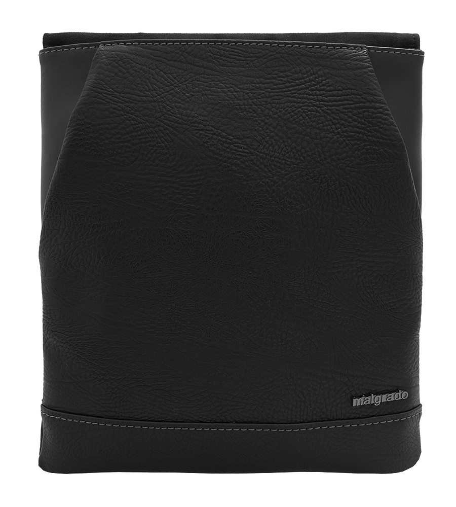 Мужской портфель Malgrado из натуральной кожи черного цвета, твердая "слоновья" кожа. У сумки одно основное отделение, внутри него кармашек на молнии и бизнес-блок состоящий из кармашков для 2 ручек, кармашек для телефона, 3 кармашка для карточек. У сумки спереди и сзади по бокам сумки оригинальные крестовые глубокие карманы , т.е. всего 4 кармана. На задней стороне сумки карман на магнитной кнопке. На передней стороне сумка накрывается клапаном с ремешком на магните. У сумки несъемный регулируемый текстильный фирменный ремень.