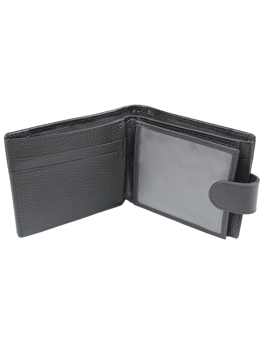 Портмоне торговой марки Malgrado из натуральной кожи. Внутри три основных горизонтальных отделения для купюр, одно из которых на молнии. У портмоне два разворота. В первом развороте слева три отделения для карточек, а справа прозрачный кармашек для проездного/пропуска/фотографии. Во втором развороте слева еще прозрачный кармашек, а справа один кармашек для карточек/записок и кармашек для мелочи на кнопке. Закрывается хлястиком на кнопке.