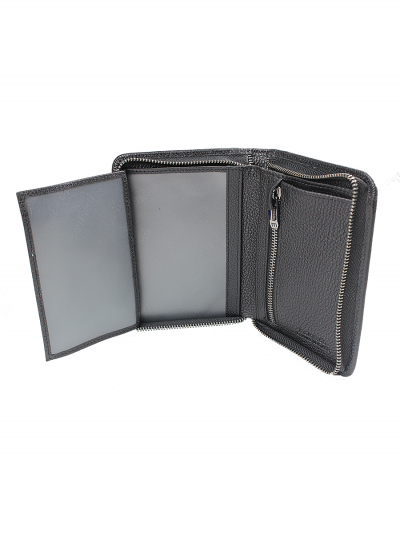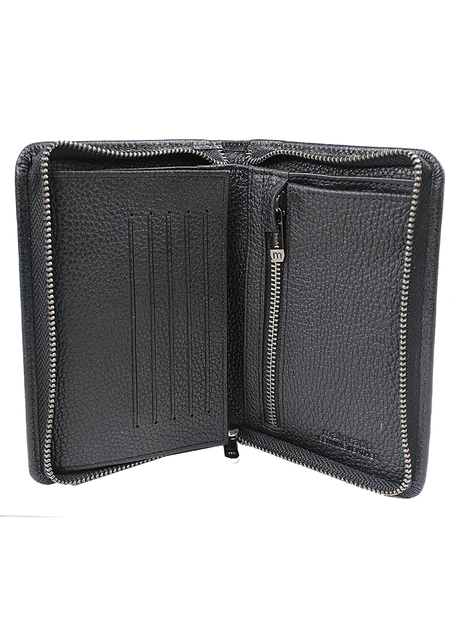 Мужское портмоне Malgrado из натуральной кожи. Портмоне закрывается на железную молнию. Внутри есть вкладка, на которой на внешней стороне 5 отделений под карточки, а на внутренней прозрачный кармашек. А также внутри на правой стороне тоже прозрачный кармашек, а на левой 2 кармашка, одни из которых на молнии для мелочи. Под купюры одно длинное отделение.