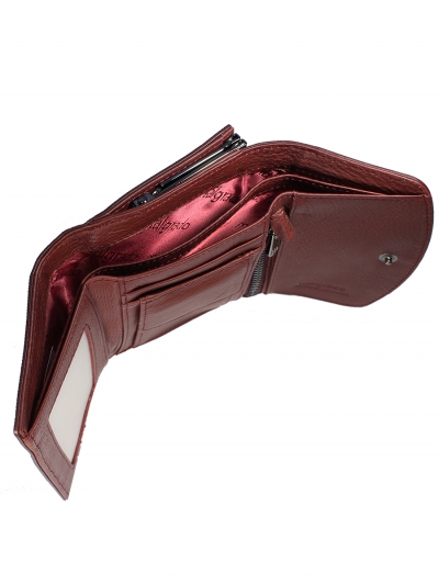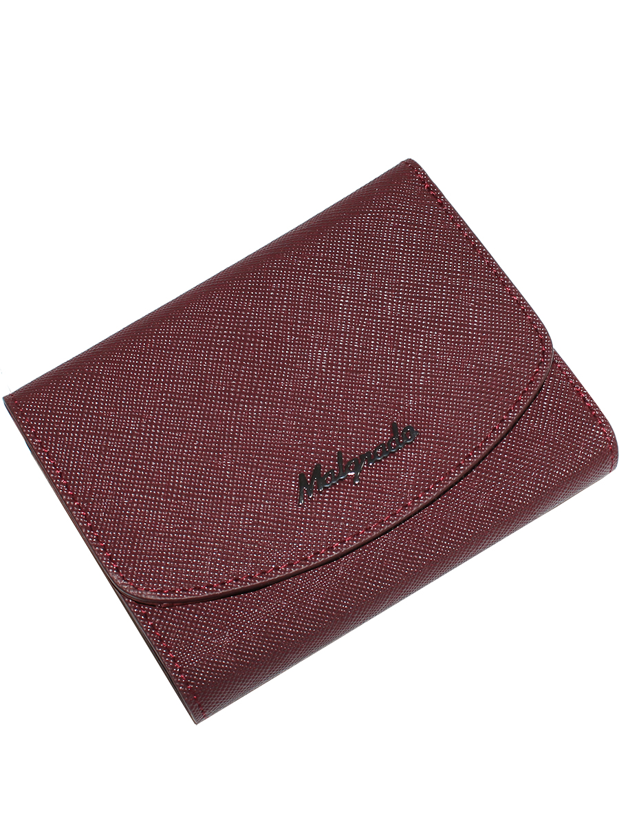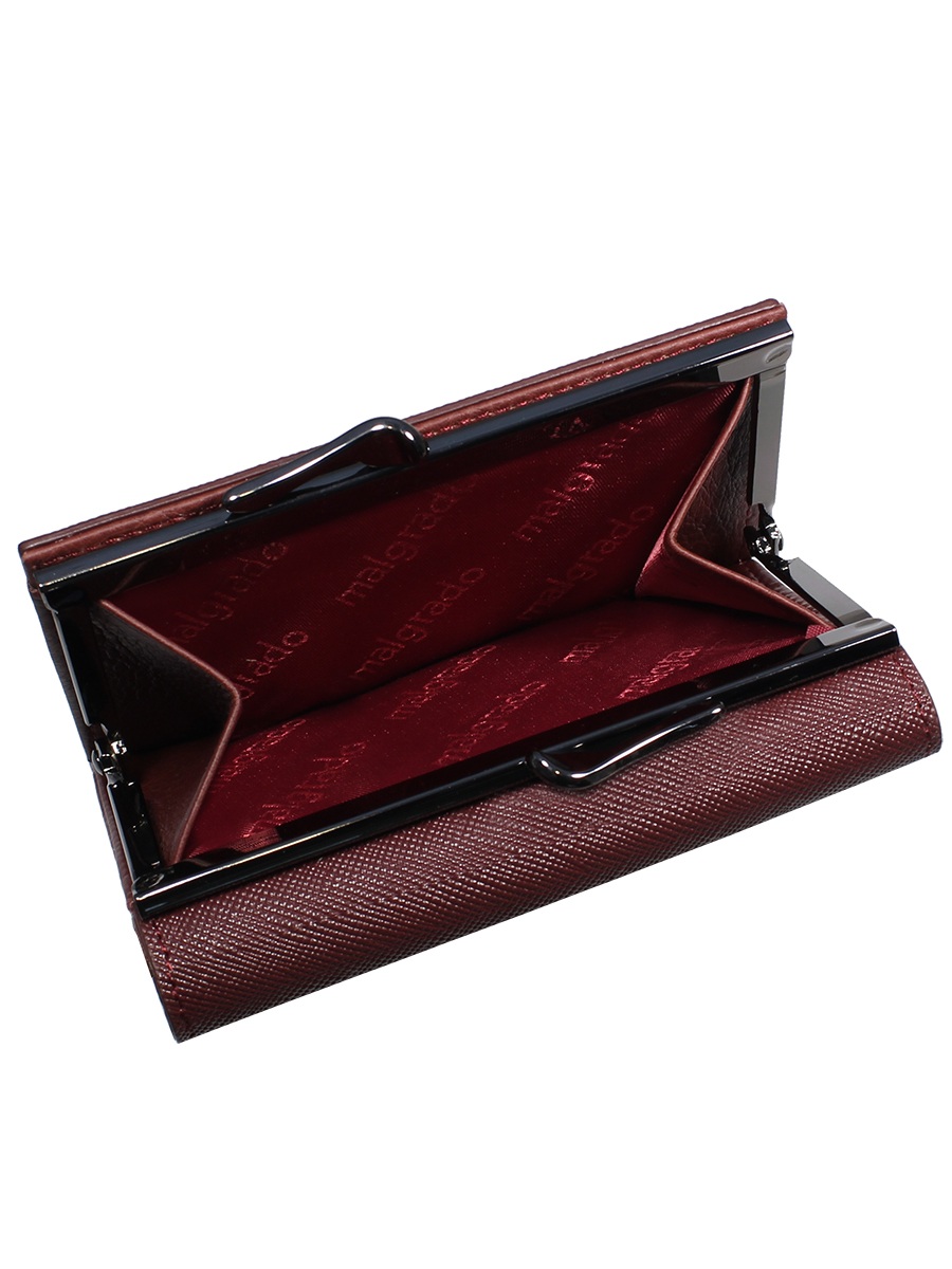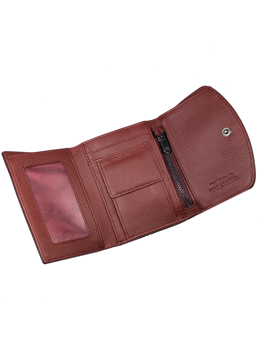 Женский средний кошелек Malgrado из натуральной кожи.В закрытом кошельке купюры лежат в три сложения. Внутри кошелька слева прозрачный кармашек, посередине два кармашка и кармашек на кнопке, а справа 2 кармашка, один из которых на молнии. Под купюры в кошельке два отделения. Внешняя монетница под рамочным металлическим замком, В монетнице одно отделение.