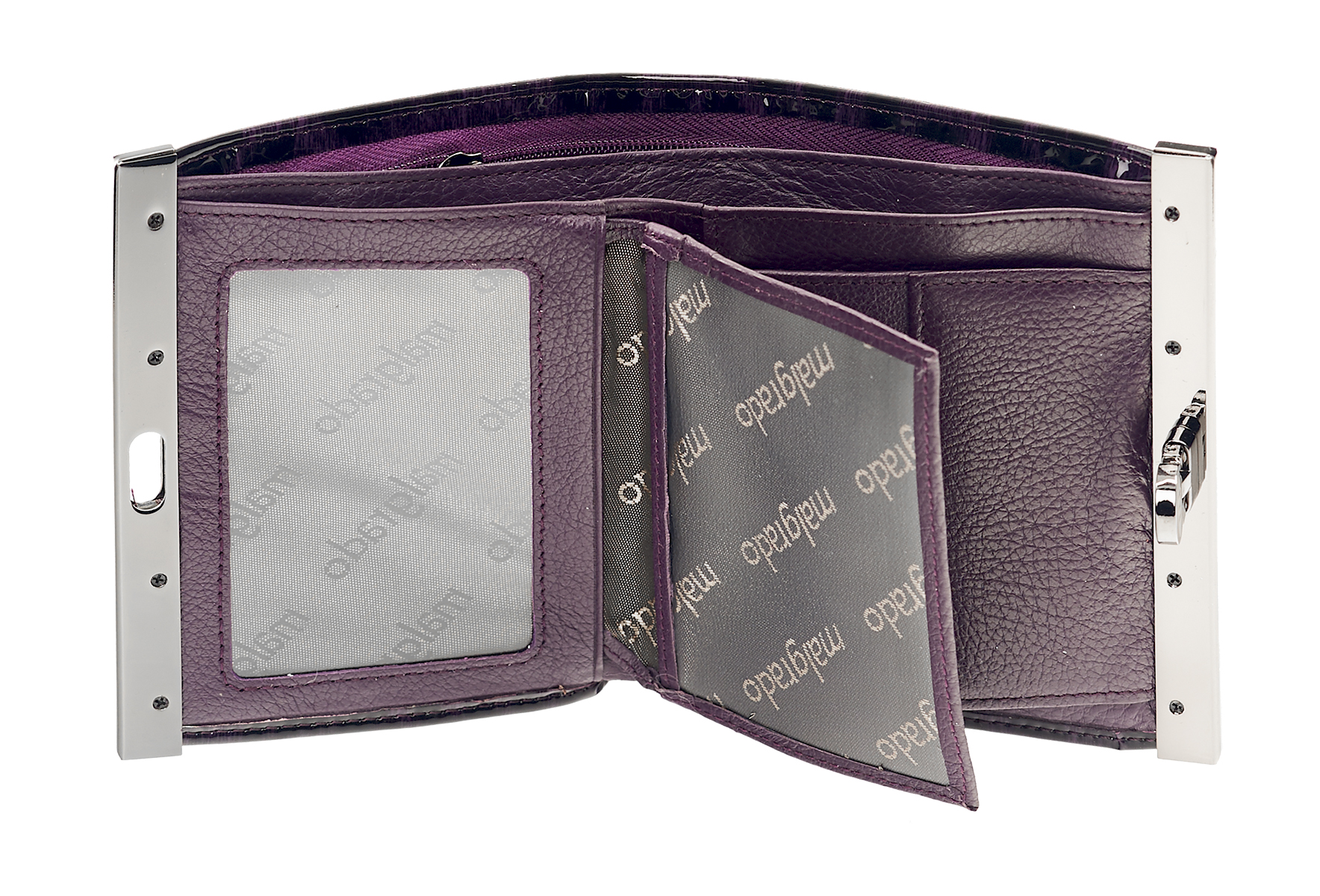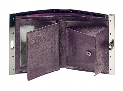 Женский средний кошелек Malgrado из натуральной лаковой кожи с рисунком под рептилию.В закрытом кошельке купюры лежат в три сложения. Внутри кошелька слева прозрачный кармашек, посередине 4 кармашка, а справа 1 кармашек. Под купюры в кошельке 2 отделения. Внешняя монетница под рамочным металлическим замком, В монетнице два отделения.