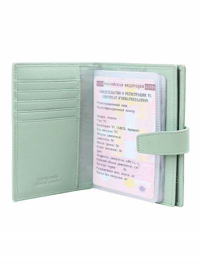 Женская обложка для документов торговой марки Malgrado. Обложка имеет два разворота, в нее можно вставить 2 паспорта, либо паспорт и права. На первом развороте справа имеется 5 отделений для карточек. Во втором развороте вставлен прозрачный вкладыш для полного комплекта автодокументов, пять отделений для кредитных и дисконтных карт. Вкладыш можно вынимать и вставить во второй разворот второй паспорт.