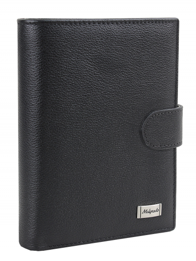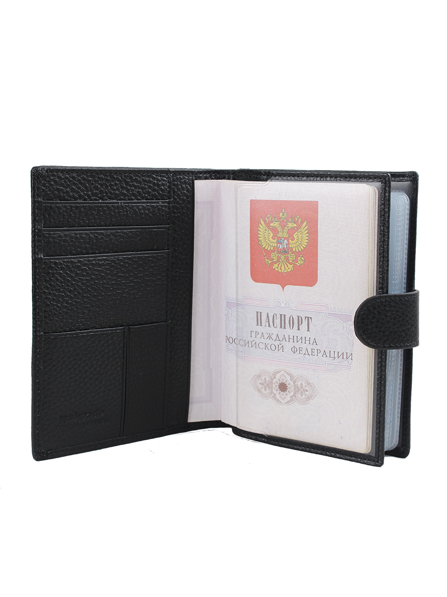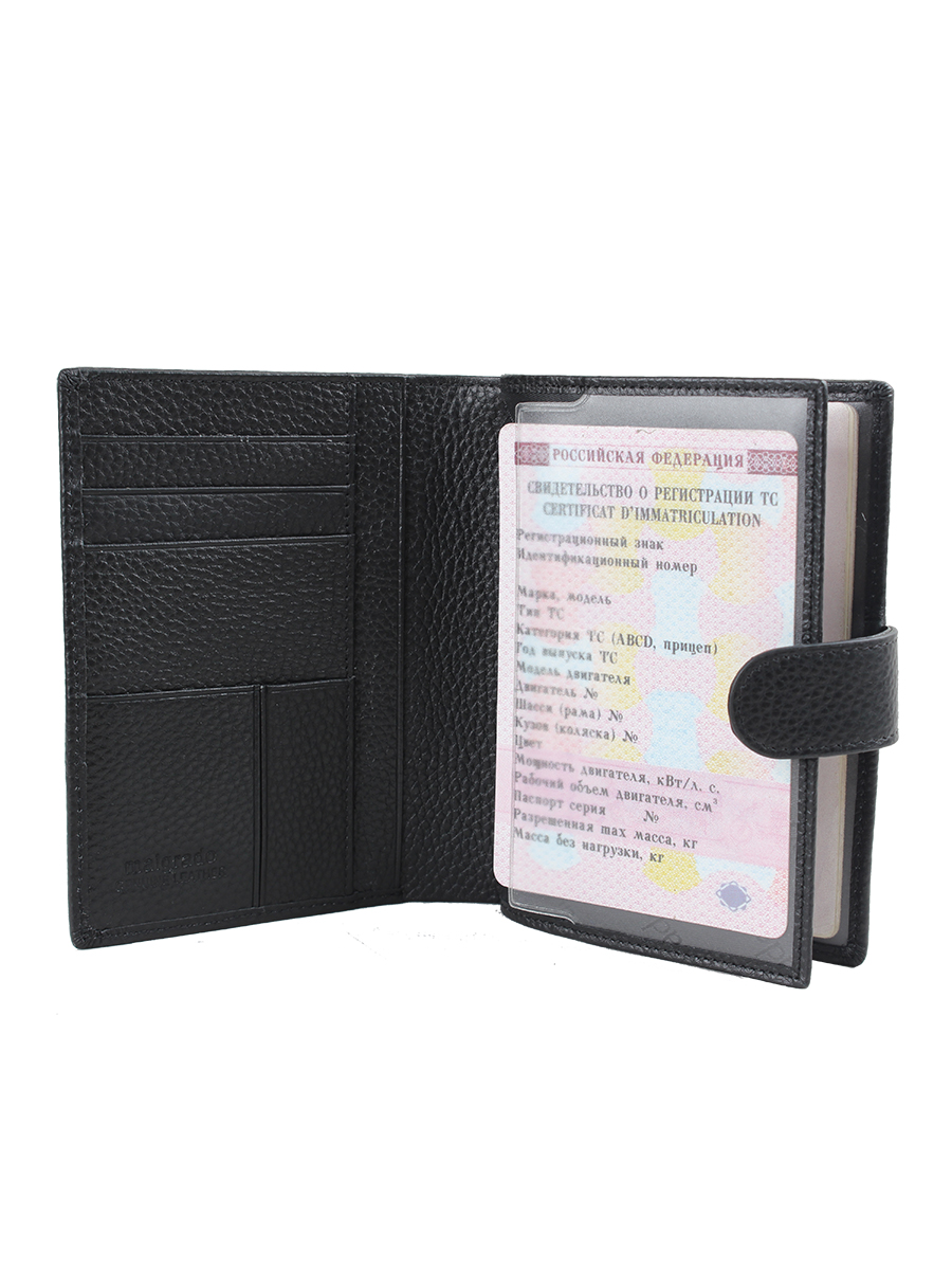 Многофункциональное портмоне из натуральной кожи торговой марки Malgrado. Закрывается клапаном на кнопке. На задней стороне имеется отделение для монет на прочной металлической молнии. С торца расположено отделение для купюр в одно сложение. В развернутом виде портмоне разделено на два отдела. В первом отделе с одной стороны расположены четыре кармана для банковских или иных карт и два скрытых вертикальных кармана. С другой стороны есть прозрачное отделение для СТС, пропуска или фотографии. Во втором отделе расположены захваты для паспорта в развёрнутом виде и пластиковый вкладыш для разных документов.