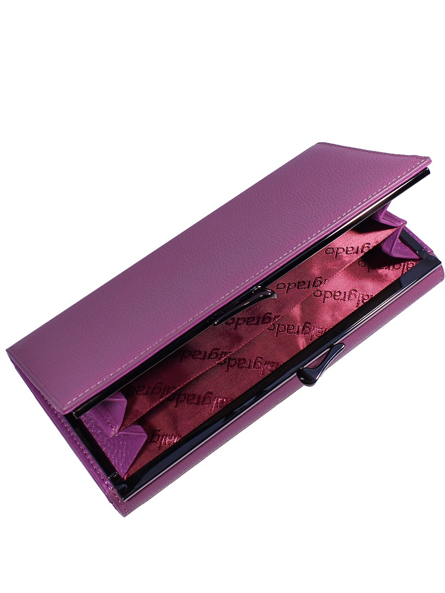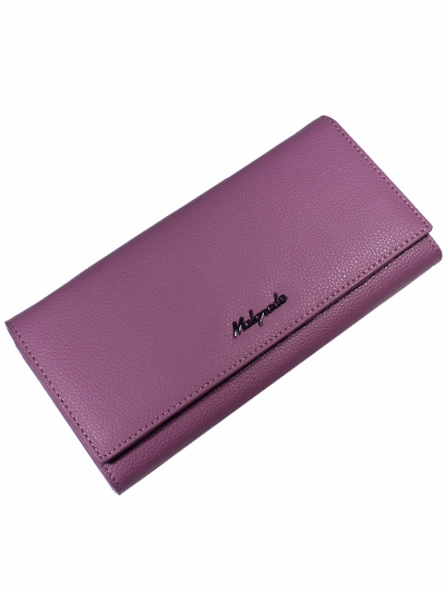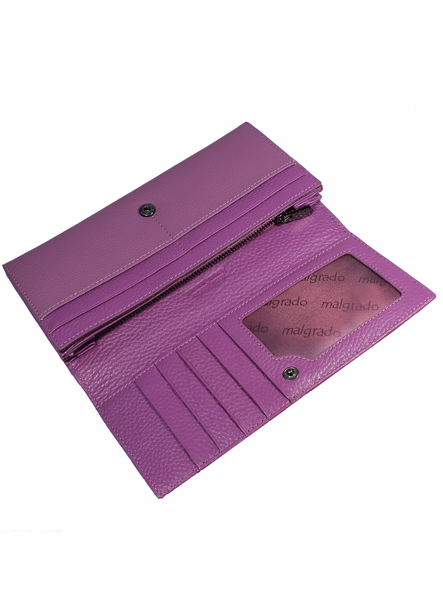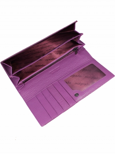 Женский кошелек Malgrado из натуральной кожи. Внутри купюры лежат в развёрнутом виде в полную длину. Внутри 4 отделения, одно из которых на молнии. На передней внешней стороне 4 кармашка. На крышке кошелька 5 кармашков для карточек, один из которых прозрачный, а также 1 продольный карман для купюр. Кошелек закрывается клапаном на кнопку. Внешняя монетница под рамочным металлическим замком, в монетнице два отделения.