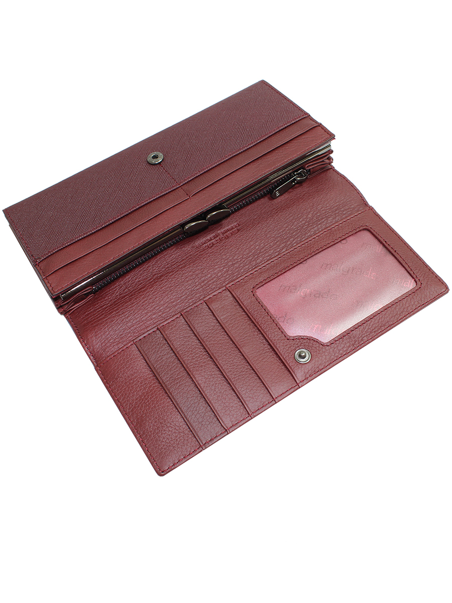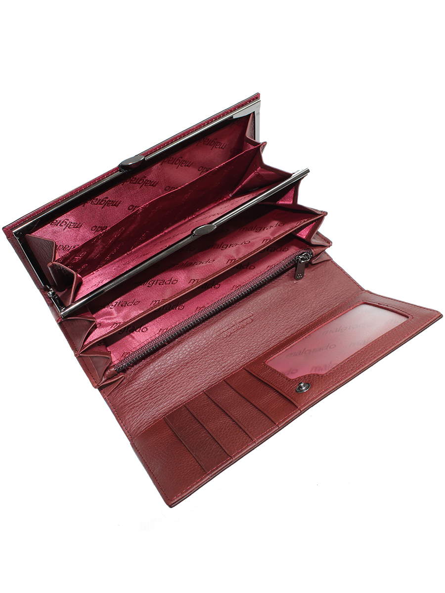 Женский кошелек Malgrado из натуральной кожи. Внутри купюры лежат в развёрнутом виде в полную длину. Внутри 4 отделения, одно из которых на рамочном металлическом замке, внутри него 2 отсека. Также есть потайной карман для купюр на молнии. На передней внешней стороне 2 кармашка для карточек и 1 продольный карман. На передней внешней стороне 2 кармашка для карточек и 1 продольный карман. На крышке кошелька 7 кармашков для карточек, один из которых прозрачный, а также 1 продольный карман. Кошелек закрывается клапаном на кнопку. На задней стороне кошелька есть кармашек.