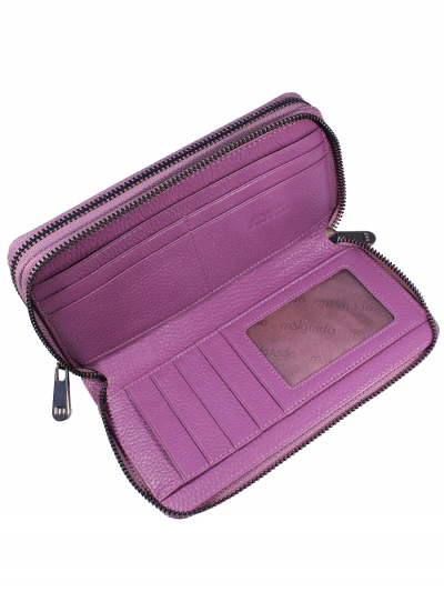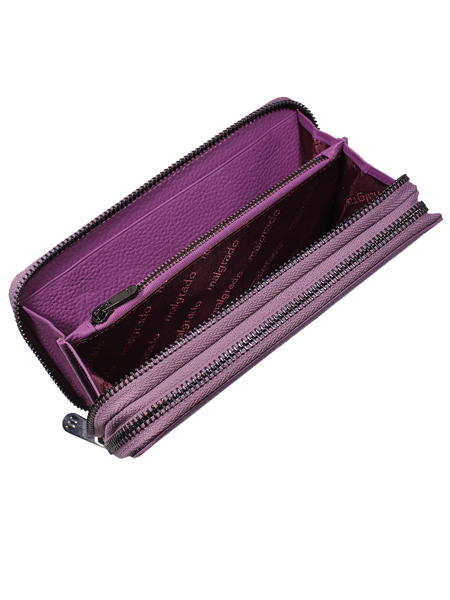 Женский клатч Malgrado из натуральной кожи. Клатч имеет два отделения на молнии. Внутри первого отделения 3 отдела, один из них на молнии; а на боковых стенках по 1 продольному кармашку. Внутри второго отделения на одной стороне 5 кармашков для карточек, один из которых прозрачный, и также 1 продольный карман для купюр; а на другой стороне 4 кармашка для карточек и 1 продольный карман для купюр. В комплект входит удобный съёмный кожаный ремешок.