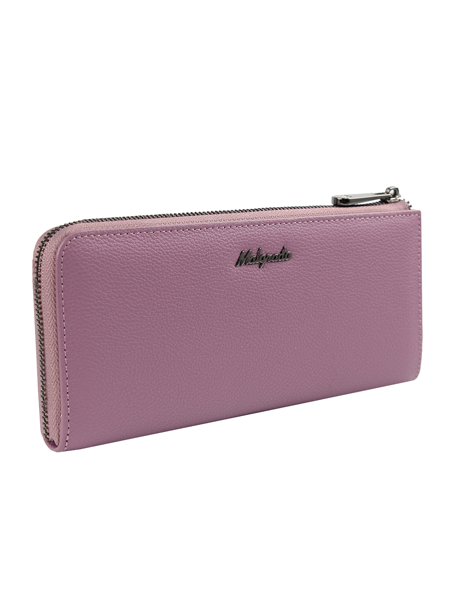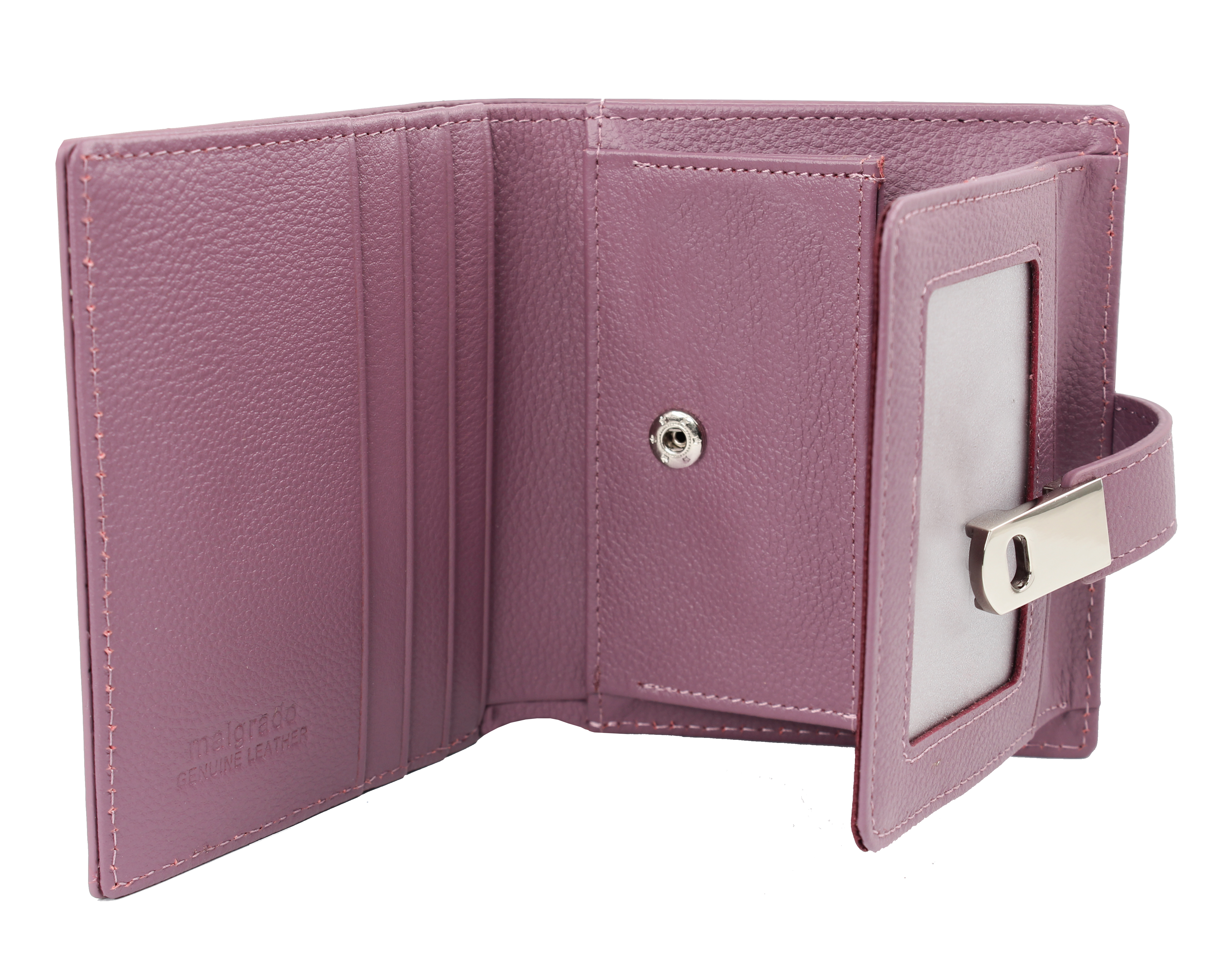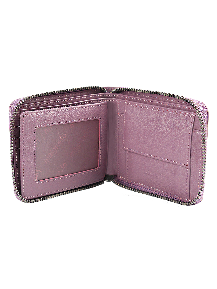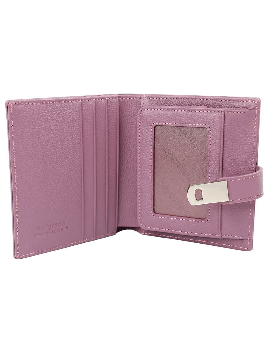 Женский кошелек Malgrado из натуральной кожи. Внутри купюры лежат в развёрнутом виде в полную длину. Внутри 4 отделения, одно из которых на молнии. На передней внешней стороне 4 кармашка. На крышке кошелька 5 кармашков для карточек, один из которых прозрачный, а также 1 продольный карман для купюр. Кошелек закрывается клапаном на кнопку. Внешняя монетница под рамочным металлическим замком, в монетнице два отделения.
